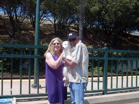 Me and my new Mom & Dad, Colleen and Wally. I am living with two other Samoyeds named Toni and Dutch and my feet never touch the ground, as you can clearly see!