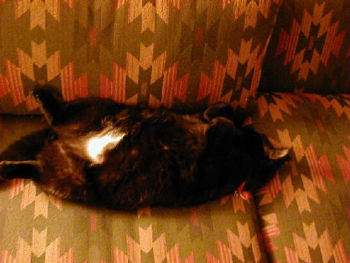 Duke relaxes upside-down on the couch, showing The Great White Spot.
