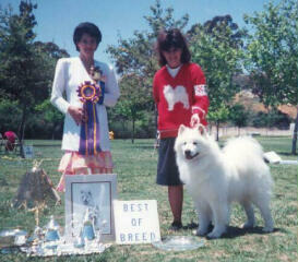 Royal was my soulmate, confidante, road partner and best friend for only 15 years. It seemed but a few moments and he was gone much too soon. He was a therapy dog, a show dog, a teacher, and a miracle I will forever be grateful to have had share a part of my life's journey. I was so proud the day he won Best In Specialty in San Diego in 1991 from Veteran class; he was 8 years old and I could barely keep up with him around the ring, and I was in good shape in those days! He loved dog shows and the applause that he just knew HAD to be for him. He left some enormous pawprints on my heart, and on the hearts of everyone he met, and I will miss his deep, magnificent 5000 year old eyes forever. Royal was collected and will be used sparingly with my girls in the future.